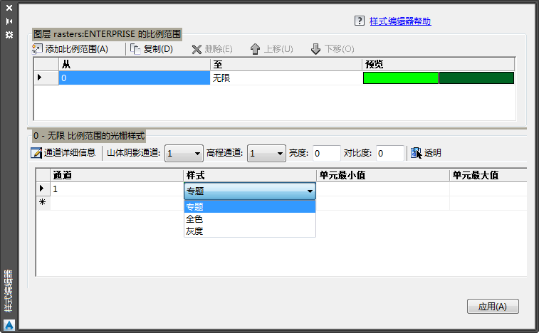 - 在样式编辑器的“0 - 无限比例范围的光栅样式”下,单击“样式”条目中的向下箭头。选择“专题”(即使已选择)。