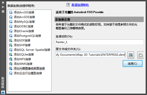 - 在“数据连接”窗口中的“通过提供程序进行数据连接”下,单击“添加光栅图像或曲面连接”,然后单击“源文件或文件夹”旁边的