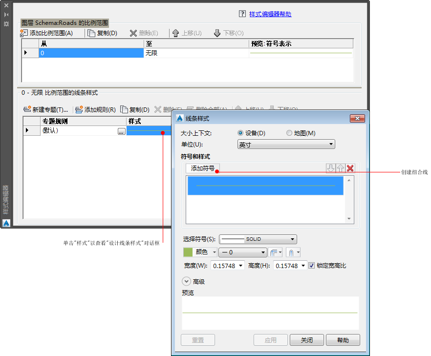将道路添加到地图中,并创建组合两种线条样式的组合样式以形成真实的道路样式。在地图中放大到特定比例范围时,将显示组合样式。而进行缩小时,将显示较简单的样式。
