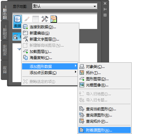 附着图形时,该图形不会在 显示管理器 中列出并且不显示在地图中。但是,它列在“当前图形”下的“任务窗格”的“地图管理器”选项卡中。