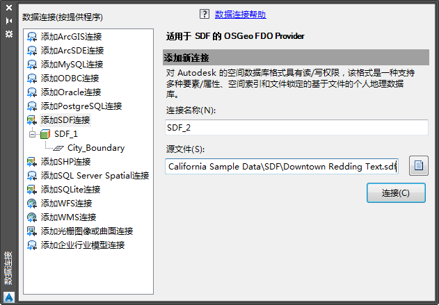 选择 SDF 提供程序并导航至样例文件 CITY_BOUNDARY.SDF。