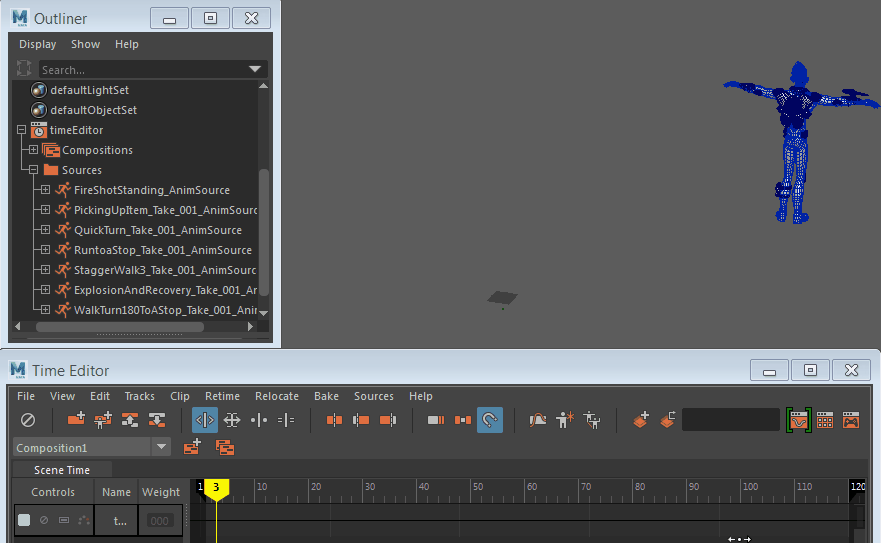 您还可以使用鼠标中键将动画源从大纲视图拖动到时间编辑器中的动画轨迹上。以下动画显示了正由大纲视图“源”(Sources)菜单中的一系列不同动画设置动画的 Sven 角色。