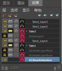 这样便设置了层层次,将 Take1_Layer1 设置为 Take1 的子对象。(请参见建立和断开动画层的父子关系。)