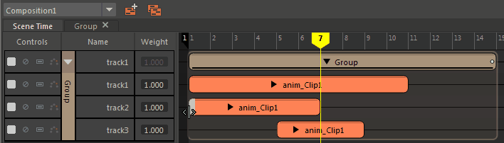 有时您希望查看组片段的内容以了解原始动画数据,即:应用由组实施的计时运算符(例如,速度曲线和时间扭曲)之前的动画数据。“本地时间”(Local Time)选项卡可用于执行此操作,以便按“本地”或片段时间检查组中包含的片段。