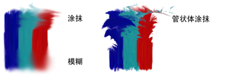可以分别将笔刷类型设定为“涂抹”(Smear)或“模糊”(Blur),使用任何笔刷在画布上进行涂抹和模糊绘制。与“擦除”(Erase)类型笔刷类似,“涂抹”(Smear)和“模糊”(Blur)类型笔刷也使用笔刷形状。例如,如果笔刷上有叶,将在绘制叶的地方绘制涂抹或模糊。