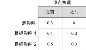 例如,下表说明了随着您将权重从一个源影响移到两个目标影响时选定顶点的权重值的变化。