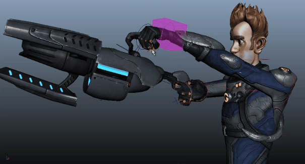 选择 IK 或 FK 效应器,并创建一个约束(父、点、方向或目标)以将该效应器作为源对象连接到目标道具。