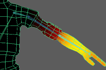 绑定蒙皮后,可以使用“绘制蒙皮权重工具”(Paint Skin Weights Tool),以直观方式编辑关节的影响。有关详细信息,请参见绘制平滑蒙皮点权重。