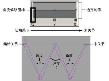 为选定的角度偏移图标指定偏移值。角度偏移是确定某关节相对于同一链中其他关节旋转速度的相对权重。角度偏移可用作倍增,以影响目标关节链中各骨骼之间的角度。