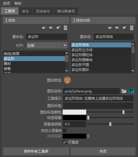 | 重命名工具架 | 在工具架编辑器的“工具架”(Shelves)部分中,选择要编辑的工具架,然后在“重命名”(Rename)文本框中输入新名称。 |