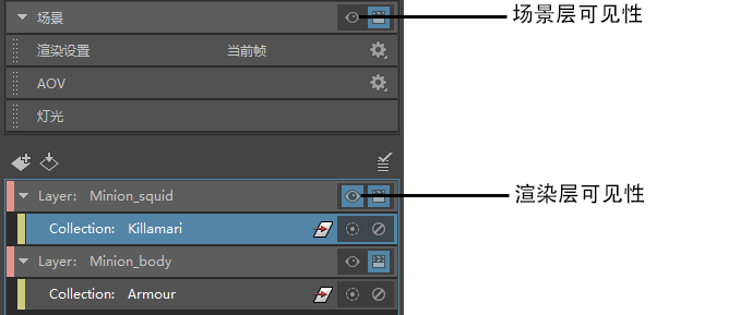 若要切换到其他渲染层或场景(主)层,请在当前层上单击