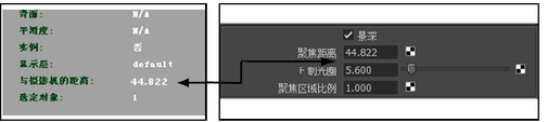 对象的部分是否位于焦点取决于 fStop 和“聚焦区域比例”(Focus Region Scale)值。 (“聚焦区域比例”(Focus Region Scale)可调整“聚焦距离”(Focus Distance)值,以增加或减小对象在锐聚焦中显示的距离。有关这些设置的描述,请参见摄影机属性编辑器。)