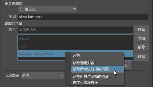 例如,如果使用“自定义过滤器”(Custom filter)创建着色器的集合,但将过滤器类型设置为仅包含 blinn 和 lambert 着色器,则所有其他着色器将被过滤掉,而不会成为集合的一部分。