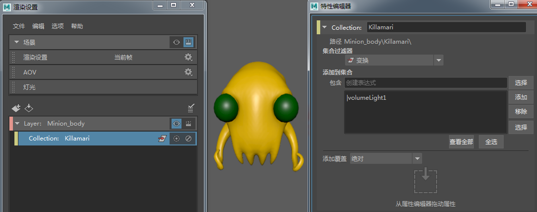 为了开始阐述此示例,我们已为 Mesh_Killamari_Body 应用 blinn7(橙色),已为 Mesh_Killamari_Eyes 应用 phong1(绿色)。已创建渲染层 Minion_body,其中包含一个名为 Killamari 的集合。