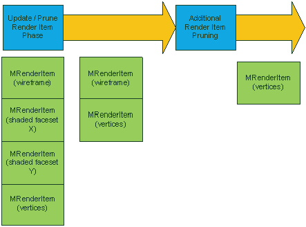 As a single render item does not represent all possibilities a collection of render items (MRenderItemList) is maintained per renderable object. However, depending on what needs to be rendered, it is possible that zero or more of these items are “enabled” (passed down the pipeline) for drawing.