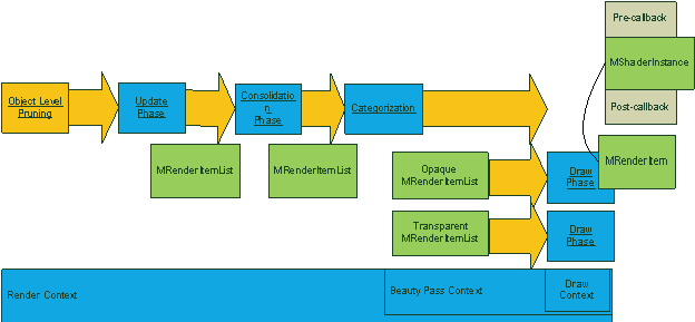 In the figure above, some of the abstract constructs from the previous diagram have been replaced with constructs exposed in the API. The Update Phase produces MRenderItems (and their associated MShaderInstances). The transparency indicator on the MShaderInstance is taken into account during the consolidation and categorization phases so that the render item may be being transferred to a “transparent” render item list. During the Draw Phase, the MRenderItem is examined. The corresponding MShaderInstance sets up the shader and updates the actual hardware shader based on the parameter values of the MShaderInstance. Geometry referenced in the MGeometry will be bound and drawn. Any pre or post callback associated with the MShaderInstance would be invoked at the appropriate times.