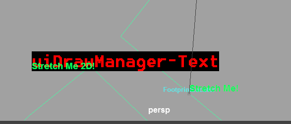 footPrintManip example: The Stretch Me! and Stretch Me 2D! text is drawn on top of the footprint locator (MPxDrawOverride) text (x-ray) and uiDrawManager (MPxDrawOverride ) sample text (transparent UI 2D).