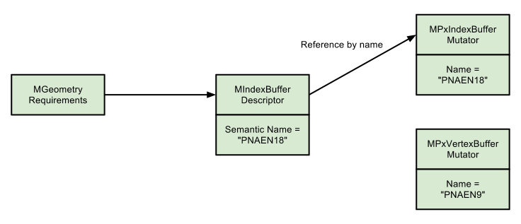 As with stream generators a unique name is used to identify the indexing that can be used. For indexing, a shader instance specifies the required indexing using a MIndexBufferDescriptor. The primitive name in the descriptor can be set to the name of the primitive generator.