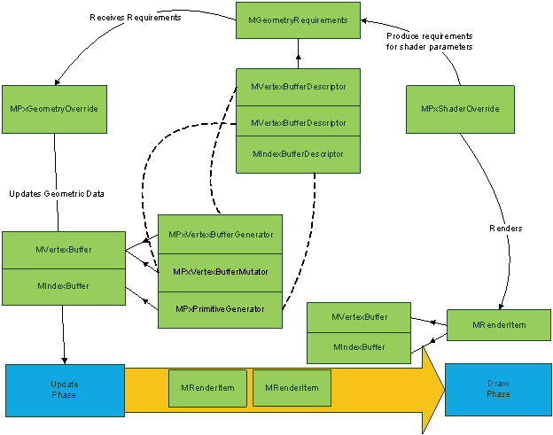 The above diagram shows how generators and mutators fit in the overall pipeline. Shown is a shader override which has custom requirements (based on shader parameters) for the generation and mutation of vertex buffers, and primitive generation (as represented by the descriptors). When updates need to occur (Update phase), the shader requirements on an MPxGeometryOverride are name matched to generators and mutators which are invoked to update or create vertex and index buffers. These custom buffers can be used by one or more render items which flow down the pipeline until it reaches the Draw Phase. At this point, the custom vertex and index buffers can be bound to the shader parameters which initiated the custom data requirement.