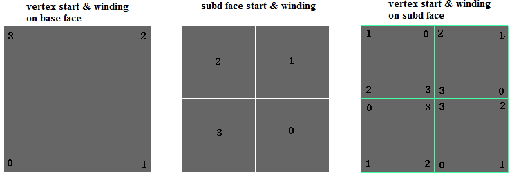 The figure above shows a base face (left image) and the start and winding order of the subdivided faces and vertices when 1 level of subdivision is applied (center and right images).