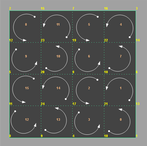Levels closer to the base level are considered as being higher. The subdivided face ordering is thus shown to be consistent with higher levels. The start face is in the bottom-left corner which aligns to the start vertex on the base face. Similarly, the vertices on the subdivided faces also start from the bottom-left corner. The winding order is always counter-clockwise (CCW).