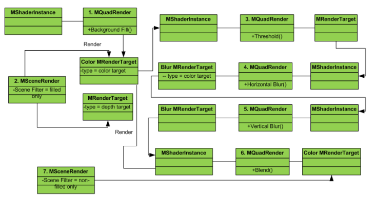 Figure 47: MSceneRender operation and the possible overrides in addition to the base set of overrides on an MRenderOperation (clear, targets, camera override) which are shown without coloring. Light green boxes are constructs which are not classes.