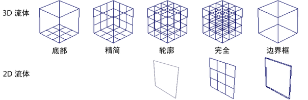 定义流体容器在 3D 视图中的显示方式。栅格与“分辨率”(Resolution)设置相对应。