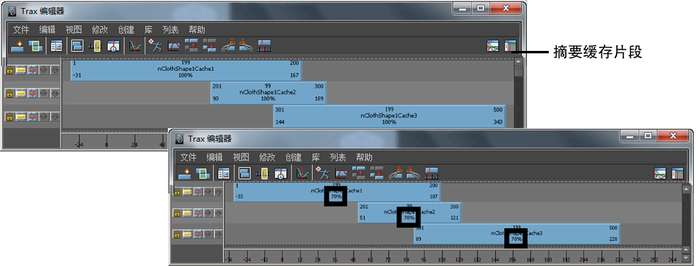 在轨迹视图中,当前对象的所有缓存都显示为片段。