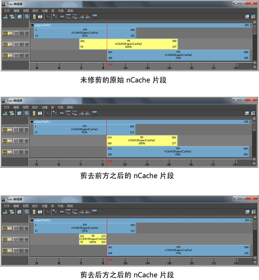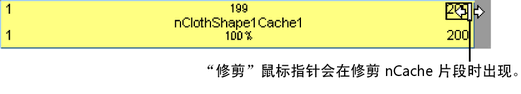可以修剪 nCache 片段以略去缓存片段开头或结尾的模拟分段。这会更改缓存片段的“源输入”(Source In)和“源输出”(Source Out)时间。修剪 nCache 片段不影响磁盘上关联的缓存文件。使用修剪功能从缓存片段中略去的分段不会被删除,在还原缓存片段的原始长度时,可以恢复这些分段。