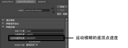 逐顶点速度数据通过 polySurfaceShape 节点的名为“运动向量颜色集”(Motion Vector Color Set)的颜色集传递到输出网格。默认情况下,该颜色集使用从流体对象生成的“velocityPV”数据。