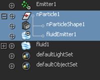 如果 nParticle 对象设定为发射流体,则 nParticleShape 和 fluidEmitter 对象都将列在 nParticle 下的“大纲视图”(Outliner)中。