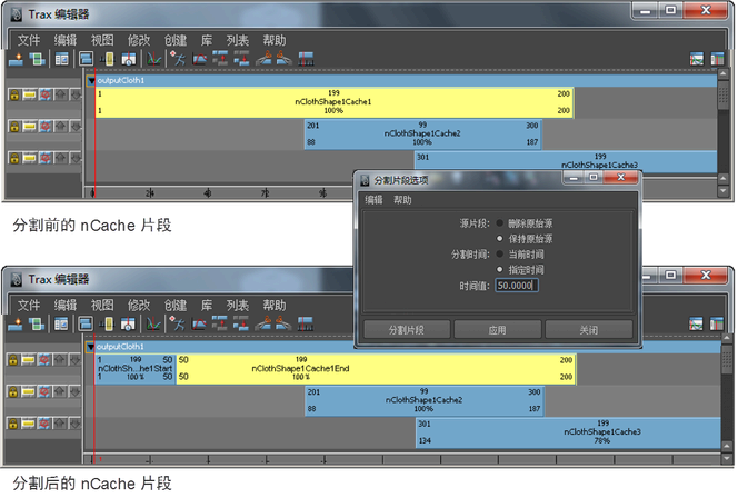 nCache 片段根据“分割片段选项”(Split Clip Options)窗口中的当前设置进行分割,两个片段将替换选定缓存片段显示。请参见 Trax 编辑器“编辑”(Edit)菜单中的“分割”(Split)。