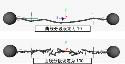 闪电由具有挤出曲面的柔体曲线组成。“曲线分段”(Curve Segments)值将设定闪电中的分段数量。