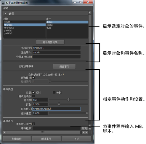 也可以使用 MEL 程序创建粒子碰撞事件。有关信息请参见为碰撞事件创建 MEL 程序。