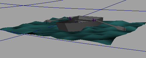 船定位器在 Y 方向上跟随海洋的运动,但另外会在 X 和 Z 方向上旋转以允许船在波浪中俯仰和侧滚。