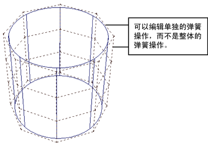 如果在弹簧对象中启用“逐弹簧刚度”(Per-spring Stiffness)、“逐弹簧阻尼”(Per-spring Damping)或“逐弹簧静止长度”(Per-spring Rest Length),则可以编辑各个弹簧的刚度、阻尼和静止长度。