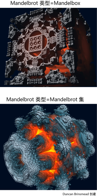 - 在“Mandelbrot 类型”(Mandelbrot Type)的五个求值类型中进行选择:“Mandelbrot 集”(Mandelbrot Set)、“Julia 集”(Julia Set)、“Mandelbox”、“带 Julia 集的长方体”(Box with Julia Set)、“带 Mandelbrot 集的长方体”(Box with Mandelbrot Set)。
