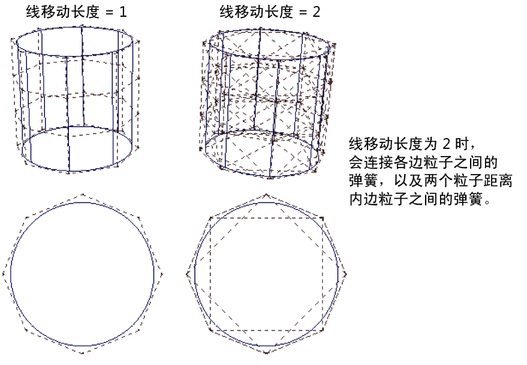 该选项可以与“线框”选项一起使用。它设定在边粒子之间创建多少个弹簧。例如,对于每个边粒子,值 2 会为距离在两个粒子内的所有边粒子创建弹簧。线行走长度越长,柔体的结构越强大。
