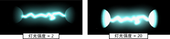 创建闪电时,也会创建闪电中心的灯光,其会将灯光投射到周围的对象上。默认的灯光强度基于“辉光强度”(Glow Intensity)属性和这两种强度的“闪电开始”(Lightning Start)和“闪电结束”(Lightning End)属性差异。“灯光强度”(Light Intensity)属性乘以该默认强度。增加灯光强度的值可以增加周围对象的闪电效果。