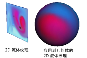 将 2D 流体纹理映射到表面着色器会在表面上创建流体图案。
