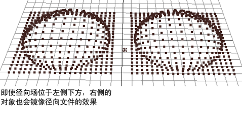 假设您创建了一个粒子栅格,并将它连接到下方的径向场。使用“复制输入连接”(Duplicate Input Connections)创建粒子栅格的复制,然后移动复制栅格到一个新位置。右侧对象镜像径向场的效果,即使径向场被放置在左侧对象。