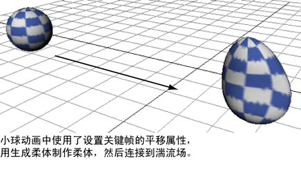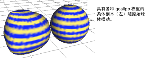 例如,假定选中“复制,将副本生成柔体”(Duplicate, Make Copy Soft)和“将非柔体作为目标”(Make Non-Soft a Goal)时,使球体成为柔体。接下来,设置关键帧以设定目标对象的运动的动画,目标对象就是原始球体。然后,赋予柔体副本的粒子各种 goalPP 值。在播放动画时,柔体副本在跟随原始球体时,会像抖动的凝胶一样变形。请注意,通常将通过启用“隐藏非柔体对象”(Hide Non-Soft Object)来隐藏原始球体。