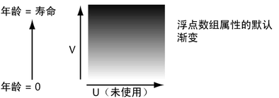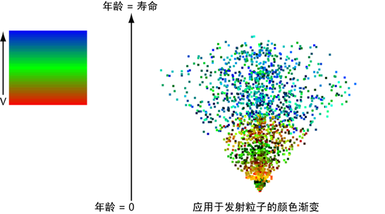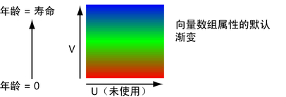 对于以上默认渐变,将“粒子的年龄”(Particle’s Age)同时用于“输入 U”(Input U)和“输入 V”(Input V)没有任何好处,因为渐变颜色不会在 U(水平)方向更改。