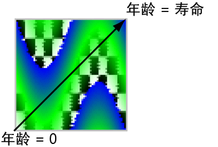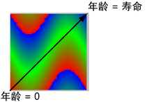 在寿命的中间阶段,向量组件等于 0、1、0,因为 RGB 值为绿色 (0, 1, 0)。在寿命的结束阶段,向量组件等于 0、0、1,因为 RGB 值为蓝色 (0, 0, 1)。Maya 对这三个点之间的向量组件插值。