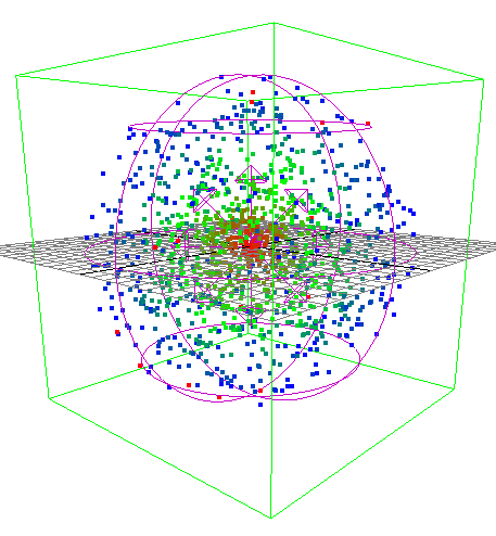 在该示例中,我们将根据粒子与原点的距离,使用渐变的 V 坐标系来设置粒子的颜色。该示例使用发射器和场,以下章节有所介绍。在执行该示例之前,您可能希望阅读有关发射器和场的信息。或者,您可以将 MEL 节点剪切并粘贴到“脚本编辑器”(Script Editor)中来创建发射器和场。