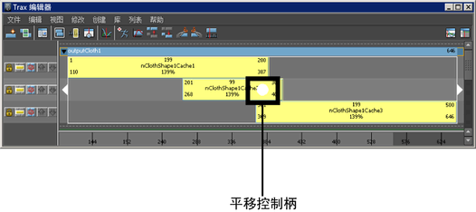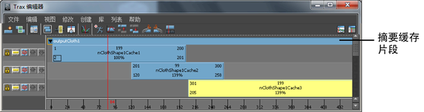 所有选定对象的缓存节点会作为缓存片段加载到“Trax 编辑器”(Trax Editor)中。每个片段会放置在它自己的轨迹上,并会按对象的缓存标签(outputCloth 对应于 nCloth 缓存,nParticleShape 对应于 nParticle 缓存,fluidShape 对应于流体缓存)对所有对象的缓存片段进行分组。
