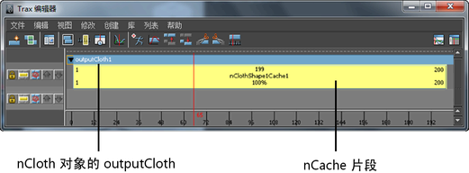 - 在“Trax 编辑器”(Trax Editor)中,为要在场景中选择的对象选择 nCache 片段。