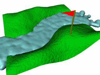 例如,要创建水流下溪谷的场景,您首先要创建 NURBS 或多边形曲面作为有溪谷的山。然后在溪谷中间从头至尾创建一条曲线。您可以在曲线上使用“曲线流”(Curve Flow)效果并调整“曲线流”(Curve Flow)属性。最后,为发射粒子选择适当的渲染类型(例如滴状曲面)并调整其外观。