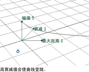 在某些情况下,代表属性的线是相对值。例如,如果拖动“幅值”(Magnitude)使其超过 10,则相应的线会捕捉到固定位置。发生这种情况后,您可以根据需要随意拖动该值,该值拖动得再高也不会在工作区中看不到操纵器。某些直线和曲线表示实际度量,例如,“最大距离”(Max Distance)和“衰减”(Attenuation)。