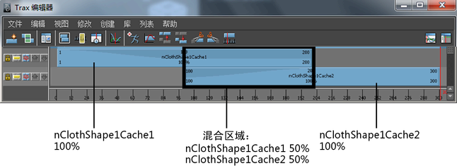 可以调整缓存片段融合的平滑度,方法是调整其权重设置,或操纵其权重曲线。例如,有两个重叠缓存片段,一个来自帧 0-200,另一个来自帧 100-300,并且两个片段的“输入权重”(Input Weights)都已设定为 0.5 (50%),则在播放过程中这两个片段将对其对象在帧 100-200 处的变形做出相同贡献。